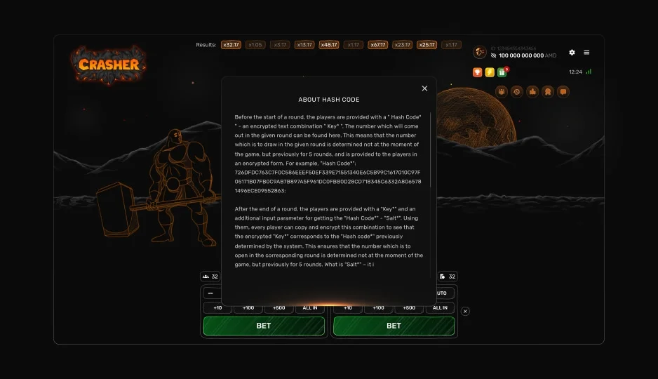 - Historique des tours — consultez les résultats passés après chaque tour. Analysez les données récentes pour comprendre le flux de Crasher. Chaque tour est totalement indépendant des précédents